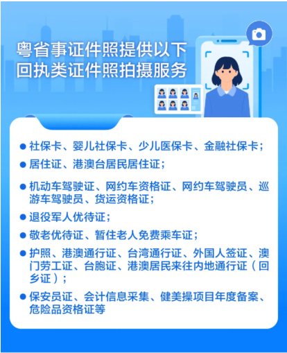 為提升業(yè)務辦理效率,讓市民平日拍照、辦證少跑腿、自主掌上辦,粵省事匯聚整合一站式便民服務,提供證件照拍攝、在線獲取回執(zhí)即拍即用、辦證換領服務,不扎堆、免排隊、免奔波,實現足不出戶拍照+辦證一次全搞定!