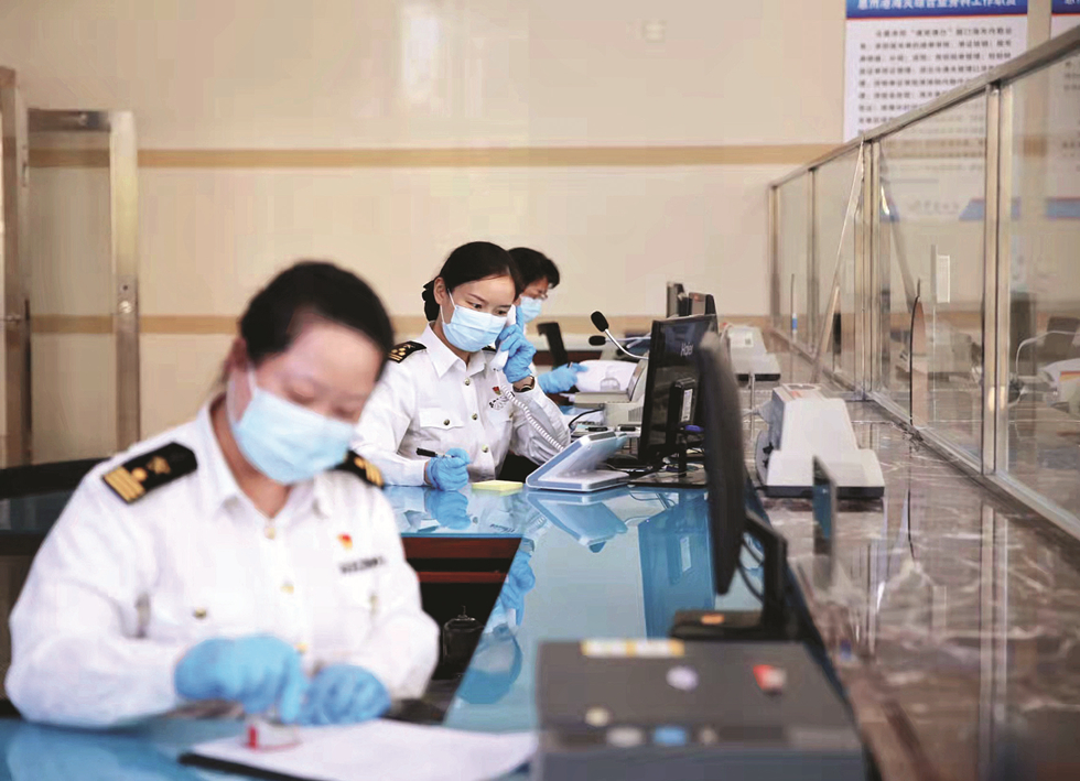 惠州港海關(guān)工作人員在服務(wù)大廳前臺忙碌著;葜輺|江圖片社供圖