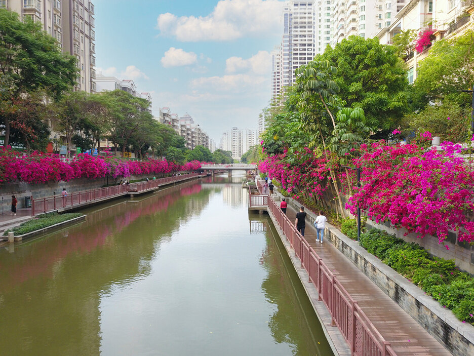 盛開(kāi)的三角梅,猶如給金山河兩岸“穿”上了一條美麗的花帶。