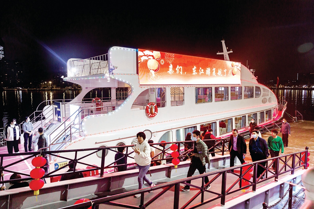 今年春節(jié)大年初一,惠州東江夜游重啟,乘客搭乘游船從合江樓畔碼頭出發(fā),一路向東觀賞水東街、東江沙公園沿線夜景,然后折返向西!霸诮峡床灰粯拥幕葜荨保@一概念一經(jīng)打出,假期市場反應(yīng)熱烈,大年初三已經(jīng)賣完初六、初七的票。