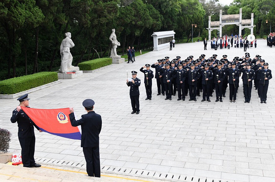 4月3日上午,惠州鐵路公安處機(jī)關(guān)、惠州地區(qū)所隊(duì)干部民警代表50余人前往惠州市豐山公園開(kāi)展祭奠英烈活動(dòng);顒(dòng)中,大家手持菊花,整齊肅立在東江人民革命烈士紀(jì)念碑前,致敬默哀,緬懷英烈們的豐功偉績(jī),表達(dá)哀思敬意。默哀完畢后,全體人員面向警旗,高舉右拳莊嚴(yán)宣誓,重溫入警誓詞。隨后,大家拾階而上,緩步繞行,瞻仰紀(jì)念碑,敬獻(xiàn)鮮花。