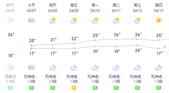 市氣象臺預(yù)計,4月7日,我市陣雨轉(zhuǎn)陰天間多云,最低氣溫13~16℃,最高氣溫24℃左右;8日,陰天到多云,最低氣溫14~17℃,最高氣溫25℃左右;9~11日,多云為主,氣溫小幅變化;12~13日,多云到陰天,局部有陣雨。