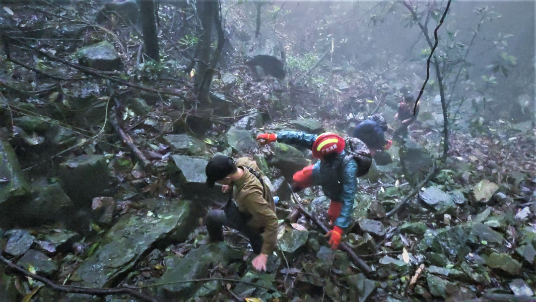陰雨連綿,山路崎嶇、山體巖石濕滑,給救援隊的工作帶來了極大的困難和危險。救援隊伍行進(jìn)半山腰時,氣溫驟降,呼嘯的山風(fēng)伴隨著濛濛細(xì)雨打濕了救援隊員的臉龐。