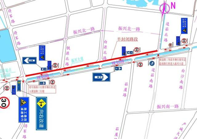 目前,一期改造工程已進(jìn)入關(guān)鍵施工階段,為確保振興大道一期改造工程能順利按期完成,根據(jù)施工計(jì)劃要求,屆時(shí)將對(duì)振興大道將軍路路口至逕茹南路口段封閉北側(cè)半幅進(jìn)行施工,保留南側(cè)半幅單向行駛,即由東向西行駛車輛從逕茹南路路口至將軍路路口現(xiàn)狀道路南側(cè)兩車道單向行駛,由西向東行駛車輛從將軍路路口南側(cè)轉(zhuǎn)入規(guī)劃路三行駛,然后從逕茹南路路口進(jìn)入振興大道(詳見附圖)。