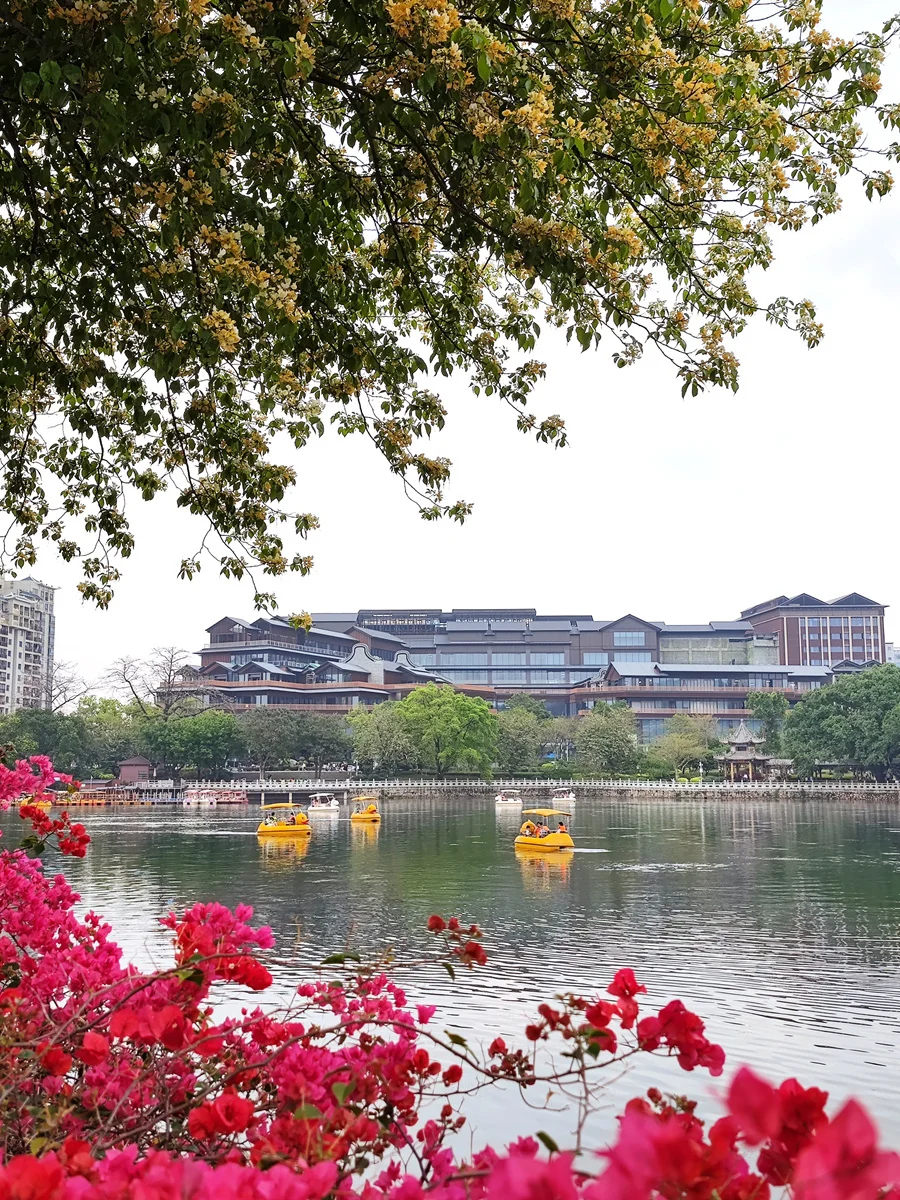 最是人間四月天,風和景明花正好。在惠州西湖陳公堤,專屬美景也如約而至:魚木繁花怒放,美不勝收。