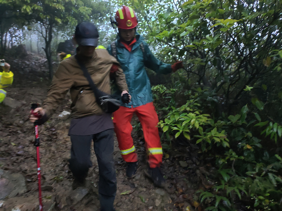 當(dāng)天8時50分許,新圩鎮(zhèn)專職消防隊再次接獲求救電話,稱該男子無法找到下山路線,身體出現(xiàn)低溫、虛弱等狀態(tài),隨時有生命危險,需要消防救助。新圩鎮(zhèn)專職消防隊約場執(zhí)勤點再次安排消防員前往白云嶂盤古廟,與熟悉山頂環(huán)境的東莞清溪山地救援會匯合。