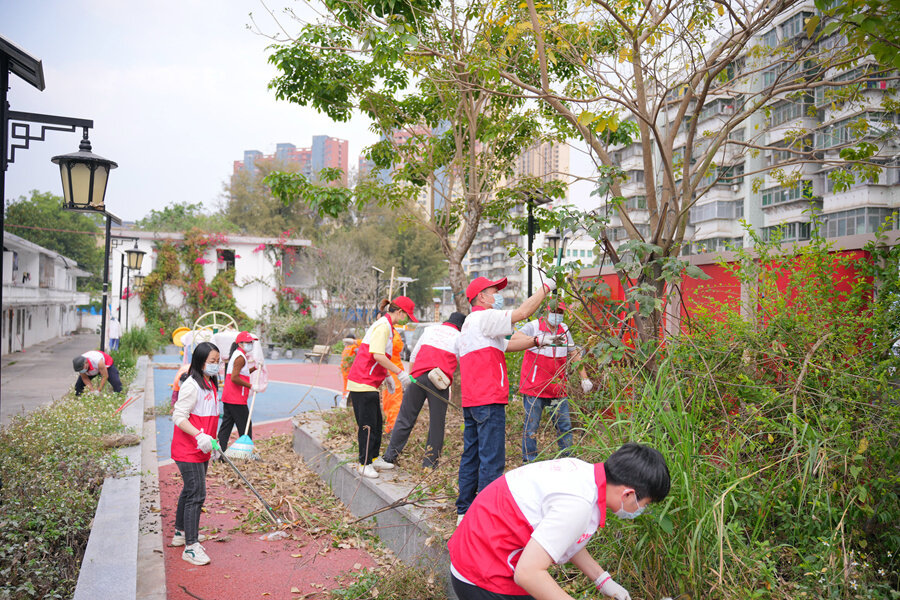 在3月17日舉辦的惠州市每月大掃除行動(dòng)啟動(dòng)儀式上,來自各級(jí)單位和部門的志愿者近百人齊聚惠城區(qū)江南街道辦事處園嶺社區(qū)石油宿舍小區(qū)廣場(chǎng),共同見證并參與此次行動(dòng)。在烈日下,他們有的拿起掃把清掃地面的落葉和垃圾,有的用手撿起綠化帶里的枯枝敗葉,有的拿起鏟子清理墻上的牛皮癬,有序分工,高效配合,讓“志愿紅”成為現(xiàn)場(chǎng)一抹靚色,F(xiàn)場(chǎng)還有工作人員負(fù)責(zé)垃圾清運(yùn)、環(huán)境消殺等工作。