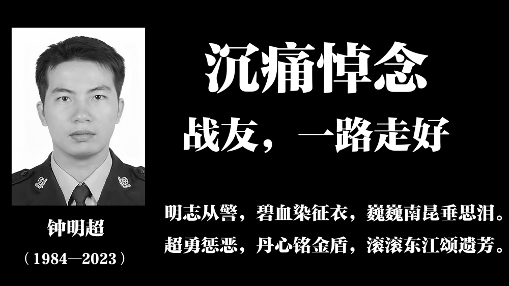 鐘明超,男,1984年12月出生,中共黨員,大學(xué)文化,2010年參加公安工作,三級(jí)警督警銜。生前系惠州市龍門(mén)縣公安局治安管理大隊(duì)一中隊(duì)中隊(duì)長(zhǎng)、三級(jí)警長(zhǎng)。從警以來(lái),鐘明超同志長(zhǎng)期奮戰(zhàn)在公安基層一線(xiàn),先后榮立個(gè)人三等功4次,個(gè)人嘉獎(jiǎng)1次,獲評(píng)“龍門(mén)縣公安局先進(jìn)個(gè)人”。2023年4月9日凌晨,鐘明超同志在執(zhí)行抓捕任務(wù)時(shí)遭受犯罪嫌疑人駕車(chē)拖行,不幸因公犧牲,年僅38歲。