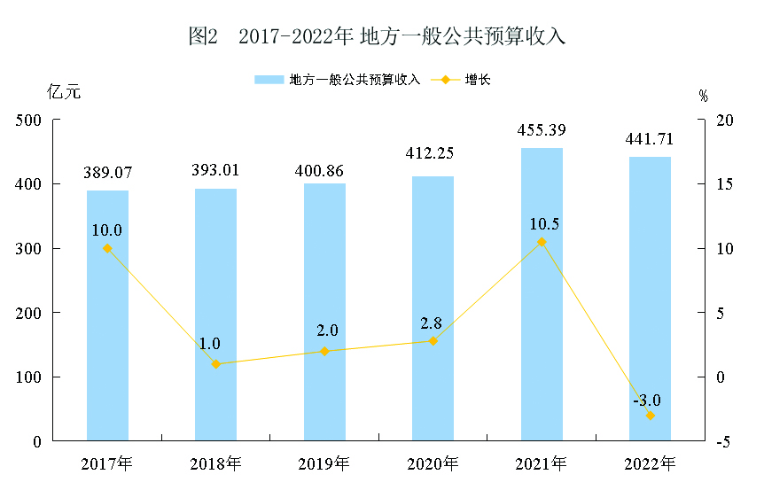 全年地方財政一般公共預(yù)算收入441.71億元,剔除留抵退稅因素后同口徑增長(以下簡稱“同口徑”)4.0%,自然口徑下降3.0%;其中稅收收入268.86億元,同口徑下降9.8%,自然口徑下降19.7%。地方一般公共預(yù)算支出693.01億元,增長4.5%。其中,教育支出144.44億元,增長5.0%;社會保障和就業(yè)支出89.02億元,增長9.5%;衛(wèi)生健康支出70.84億元,增長12.6%;節(jié)能環(huán)保支出12.59億元,下降8.1%;城鄉(xiāng)社區(qū)支出72.34億元,增長2.8%;農(nóng)林水支出50.61億元,增長2.4%;交通運輸支出16.79億元,下降2.7%。