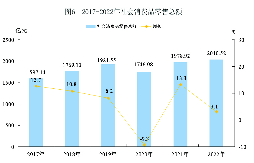 全年社會消費品零售總額2040.52億元,比上年增長3.1%。分地域看,城鎮(zhèn)消費品零售額1634.46億元,增長3.1%;鄉(xiāng)村消費品零售額406.06億元,增長3.1%。從消費形態(tài)看,商品零售1873.20億元,增長3.3%;餐飲收入167.32億元,增長0.6%。