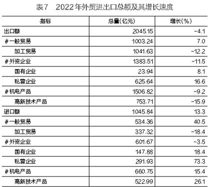 全年外貿(mào)進(jìn)出口總額3090.99億元,比上年增長1.2%。其中,出口2045.15億元,下降4.1%;進(jìn)口1045.84億元,增長13.3%。進(jìn)出口差額(出口減進(jìn)口)999.31億元。