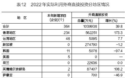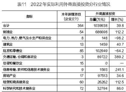 全年共簽訂外商直接投資項目合同364宗,比上年下降11.2%;外商直接投資合同金額154.89億元,下降6.4%;實際利用外商直接投資103.99億元,增長39.8%。年末全市實有外商投資企業(yè)8443家,其中,中外合資450家,中外合作(法人)133家,外資企業(yè)3944家,外商投資股份有限公司19家,外商投資企業(yè)分支機構(gòu)1197家。