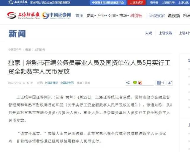 4月22日,據(jù)上海證券報報道,江蘇省常熟市地方金融監(jiān)督管理局和常熟市財政局日前印發(fā)《關(guān)于實行工資全額數(shù)字人民幣發(fā)放的通知》。該通知稱,從5月開始對常熟市在編公務(wù)員(含參公人員)、事業(yè)人員、各級國資單位人員實行工資全額數(shù)字人民幣發(fā)放。