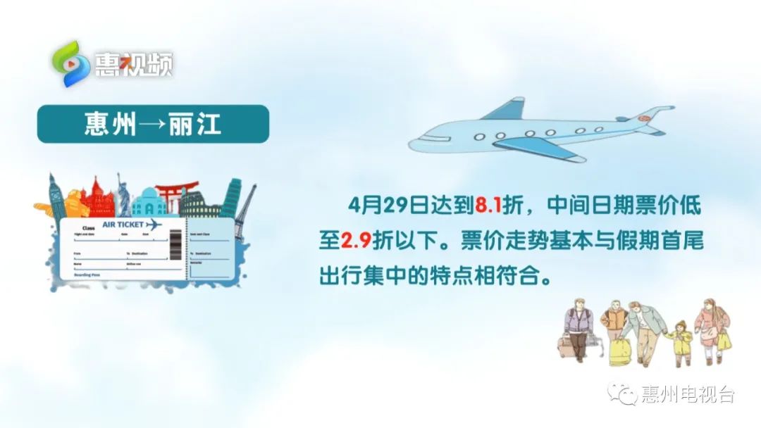 惠州直飛麗江的票價,4月29號為8.1折,中間日期票價低至2.9折以下,票價走勢基本與假期首尾出行集中的特點相符合。