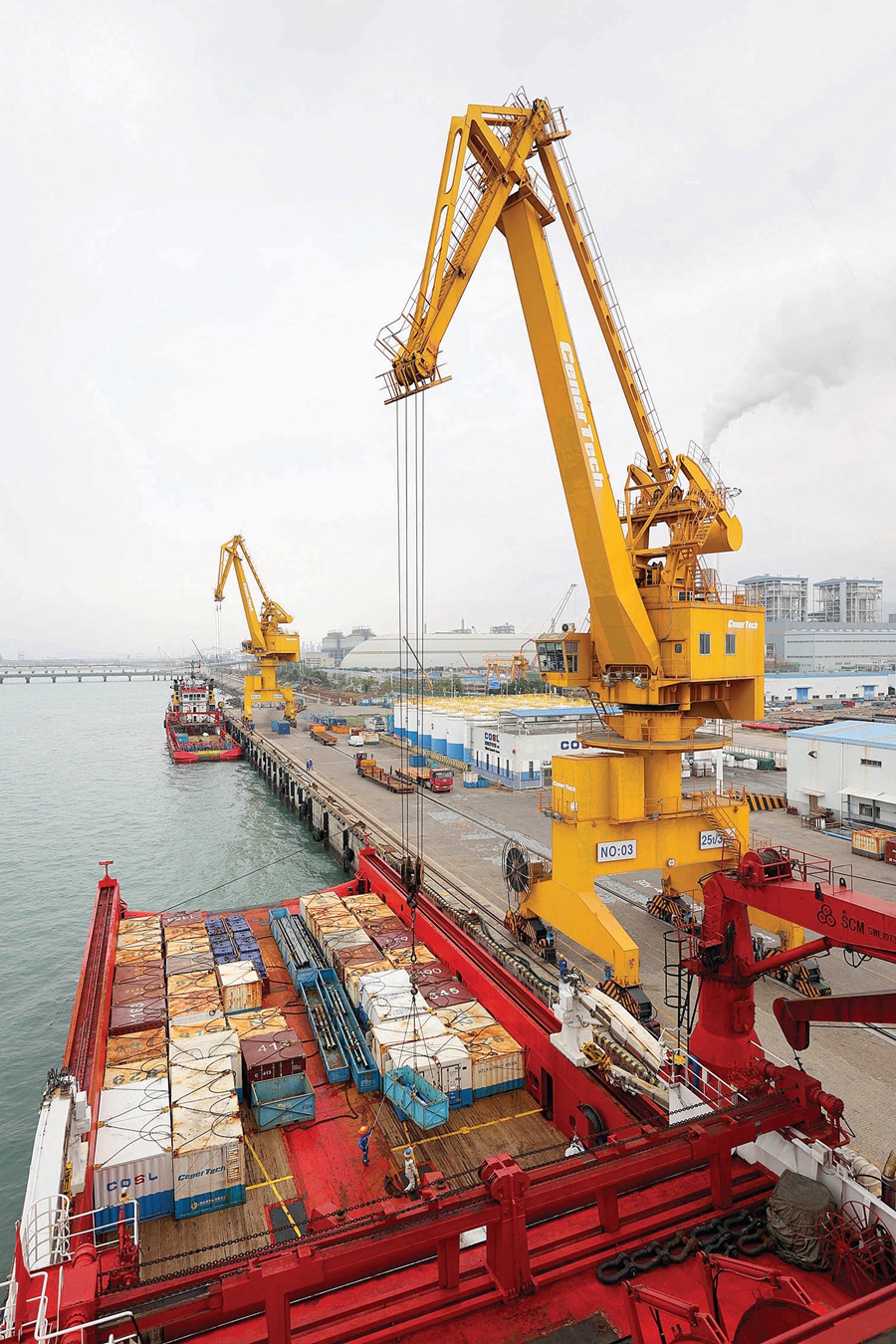 惠州大亞灣中海油惠州物流基地碼頭,吊車正將一箱箱即將送抵惠州油田海上鉆井平臺的物資裝載到“海洋石油681”船艙。
