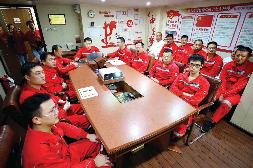 啟航前,“海洋石油681”船長召集所有船員在會議室進(jìn)行出海安全教育。