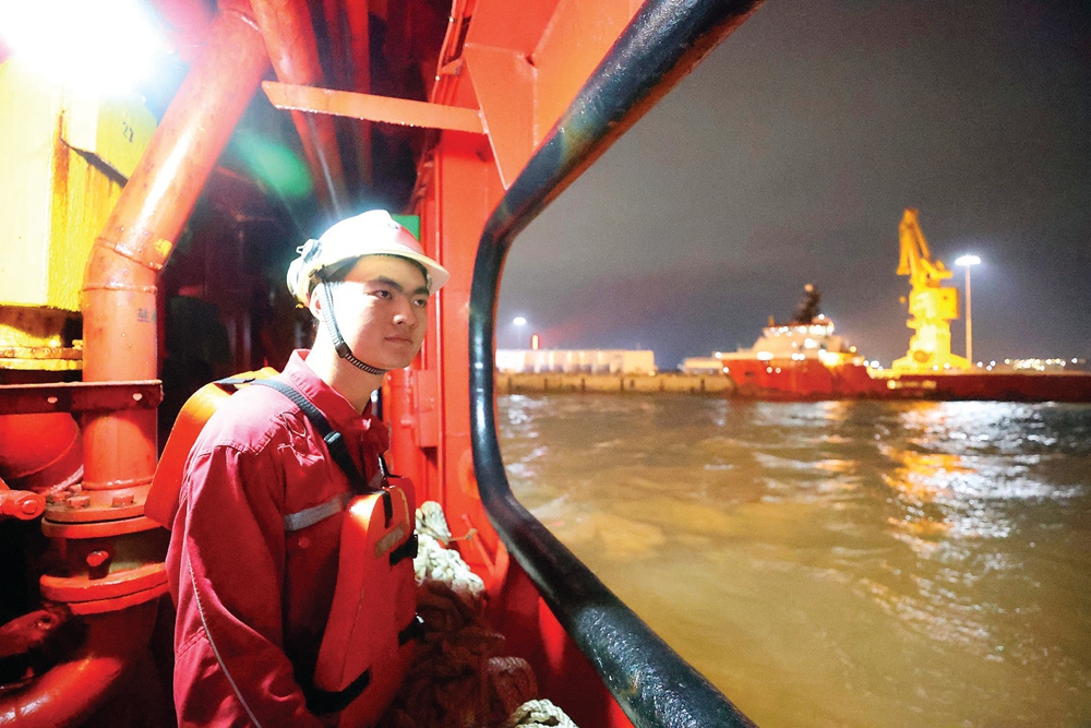 夜間行船過程中,“海洋石油681”年輕的船員在查看航道安全情況。