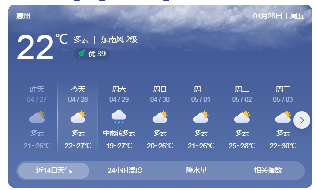 惠州市氣象臺(tái)4月27日下午的發(fā)布惠州重大氣象信息,預(yù)計(jì)28日我市多云到陰天;“五一”假期前期(4月29日)受弱冷空氣影響,有雷陣雨局部大雨;假期中后期(4月30日-5月3日)多云天氣為主,局部有陣雨。假期期間我市天氣總體平穩(wěn),適宜出行和戶(hù)外活動(dòng),但需注意29日雷雨的不利影響。