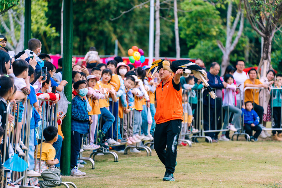 園區(qū)的動(dòng)物“明星”還有很多。走過(guò)園區(qū)的吊橋就是百鳥(niǎo)園。百鳥(niǎo)園的旁邊是一片大草坪。園區(qū)每天上午和下午在這里都有表演。最近紅遍全網(wǎng)的烏鴉喝水視頻,就是一名游客在這里拍攝的。當(dāng)天,園區(qū)來(lái)了三四個(gè)研學(xué)團(tuán)的學(xué)生。在園區(qū)工作人員的引領(lǐng)下,烏鴉喝水和飛行編隊(duì)的表演開(kāi)始進(jìn)行。聰明的烏鴉將石子一粒粒投進(jìn)瓶子里,最終成功喝到了水。工作人員一吹哨子,一群群的鳥(niǎo)兒先后飛了出來(lái),非常有氣勢(shì)。最先出來(lái)的一群萌萌的珍珠雞,第二是孔雀,最后一只巨嘴鳥(niǎo)滑翔出來(lái),在工作人員的引導(dǎo)下,和學(xué)生們互動(dòng)。學(xué)生們看到表演,發(fā)出一陣陣的歡呼。“又好看又萌!”一位小學(xué)生說(shuō)道。
