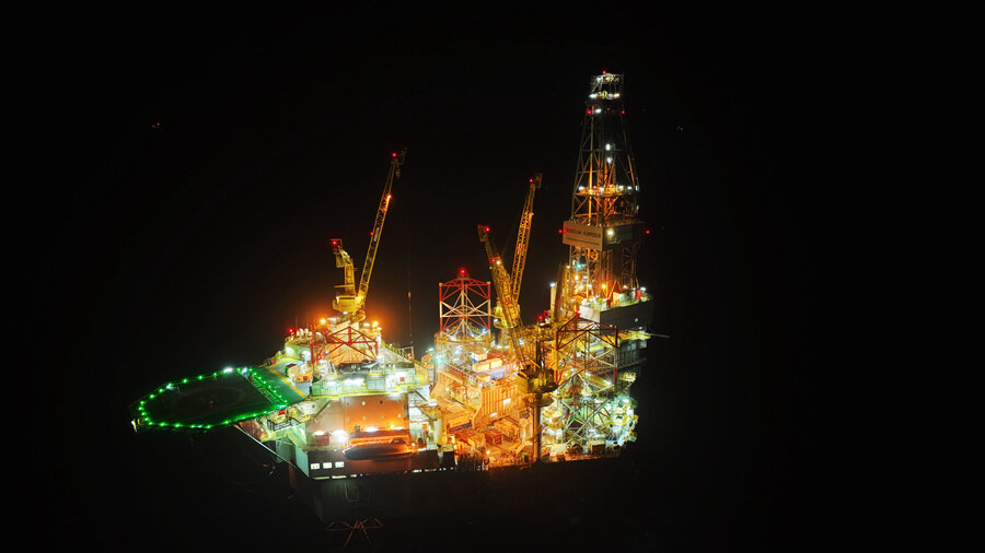 夜間航拍鏡頭下,“國瑞”平臺(tái)燈火通明,海洋石油工人輪班交替忙碌著為祖國“尋油”。