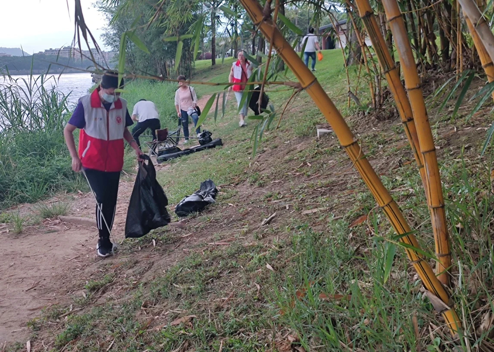 大家身穿志愿服,帶著工具參加撿跑。
