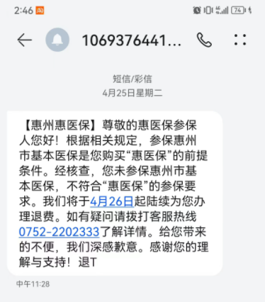 該負(fù)責(zé)人表示,由于2023年“惠醫(yī)!奔袇⒈F跒2022年11月14日~12月31日,而2023年惠州市基本醫(yī)療保險(xiǎn)中的居民醫(yī)保參保繳費(fèi)期截止日期為2023年3月31日(可享受全年待遇),從而無(wú)法在“惠醫(yī)保”集中參保期間校核參保人是否為惠州市基本醫(yī)療保險(xiǎn)參保人,待惠州市2023年度城鄉(xiāng)居民基本醫(yī)保繳費(fèi)期結(jié)束后,審核發(fā)現(xiàn)部分“惠醫(yī)!眳⒈H藛T沒(méi)有參加惠州市基本醫(yī)療保險(xiǎn)(含職工醫(yī)保和居民醫(yī)保),未能滿足“惠醫(yī)保”參保條件,因此將對(duì)此類(lèi)人群予以退費(fèi),并通過(guò)短信方式通知繳費(fèi)人。