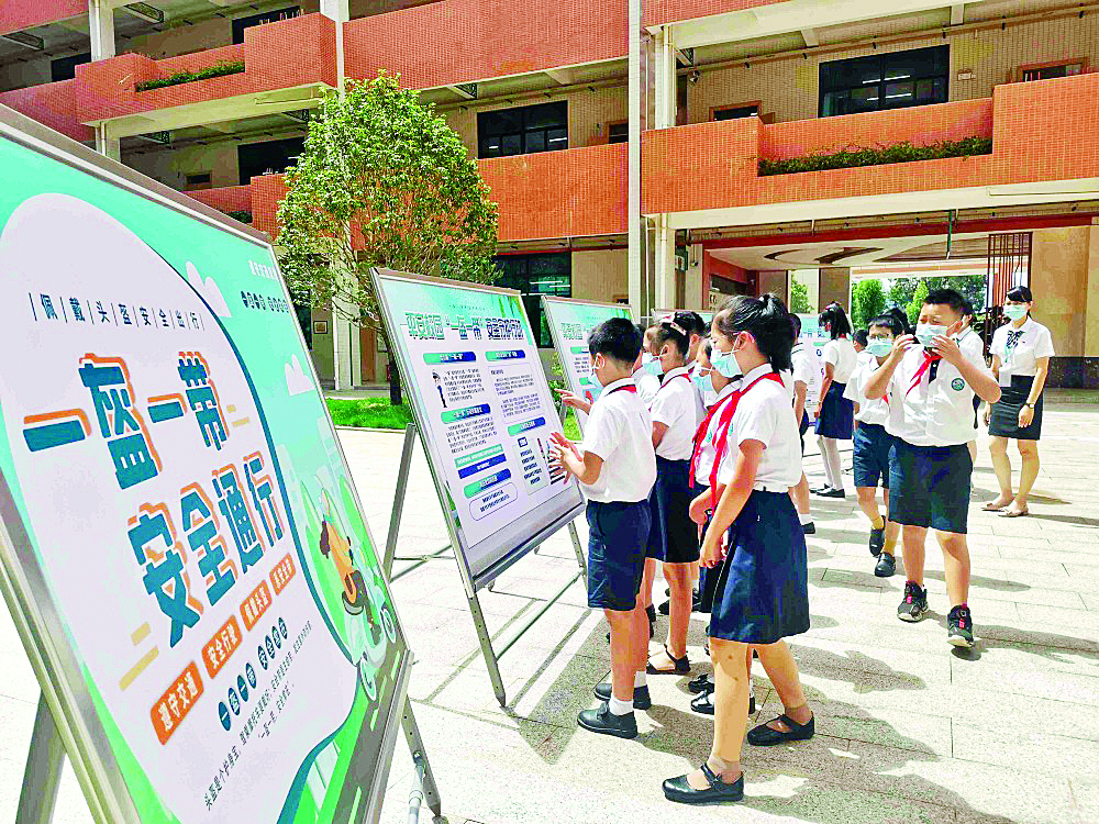 學生參觀“一盔一帶”交通安全知識宣傳展板。