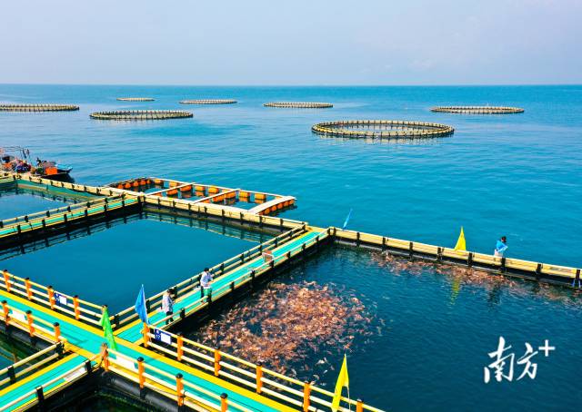 在惠東縣圣告島海域上,上百個大型深海養(yǎng)殖網(wǎng)箱整齊排列在海面上,網(wǎng)箱里養(yǎng)殖的是大黃魚、金鯧魚等大型海魚,這些魚在前期育種后被投入網(wǎng)箱,再經(jīng)過幾個月的海洋養(yǎng)殖后,出產(chǎn)海魚個頭肥大、肉質(zhì)鮮美,深受港澳市場歡迎。