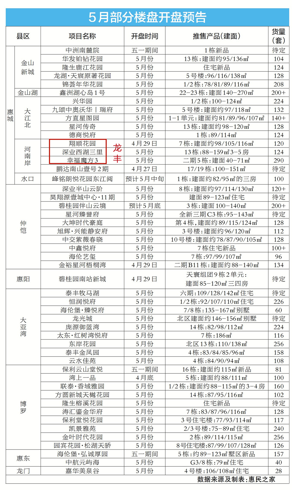 暖市政策接踵而至、市場交易氛圍回暖、民營房企接連出手拿地……為惠州開發(fā)商增添了推新的信心和底氣。據(jù)惠民之家數(shù)據(jù)監(jiān)控中心不完全統(tǒng)計(jì)(截至4月28日),2023年5月惠州全市預(yù)計(jì)有49個(gè)樓盤推新,超6500套新房入市,其中預(yù)計(jì)全新盤6個(gè),加推盤43個(gè)。