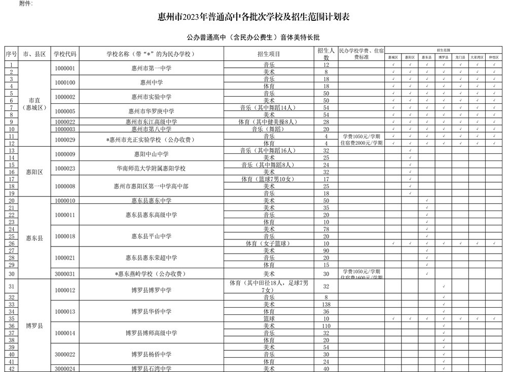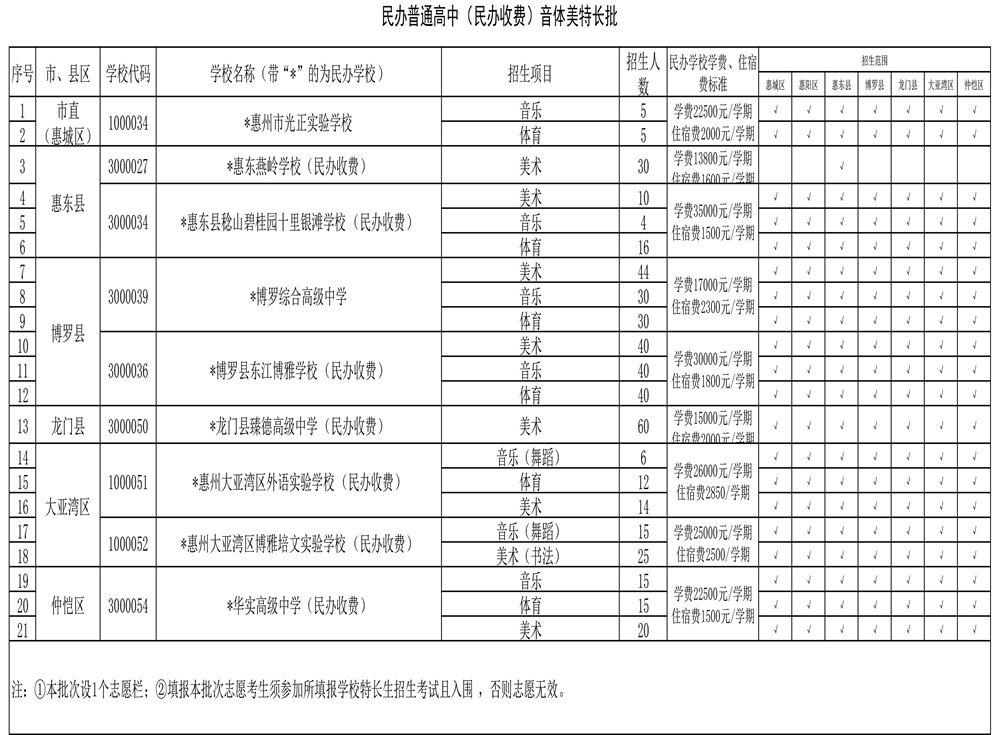 今年除個(gè)別學(xué)校外,全市民辦普通高中公辦生和民辦收費(fèi)生繼續(xù)面向全市招生。同時(shí),為進(jìn)一步推動(dòng)普通高中特色多樣化發(fā)展,各普通高中學(xué)校特長(zhǎng)生計(jì)劃招生2309人,其中市直普通高中特長(zhǎng)生全部面向全市招生?h(區(qū))公辦普通高中特長(zhǎng)生招生方面,除了惠東平山中學(xué)(女子籃球)、博羅華僑中學(xué)(籃球)、龍門(mén)中學(xué)(體育足球)、仲愷中學(xué)(體育足球)4個(gè)項(xiàng)目外,其他縣(區(qū))公辦高中特長(zhǎng)生均在屬地招生。
