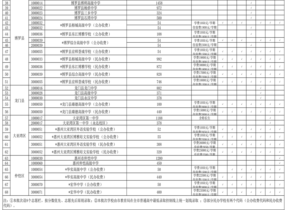 市實(shí)驗(yàn)中學(xué)北校區(qū)面向仲愷高新區(qū)招生30人,仲愷中學(xué)(惠州一中班)面向惠城區(qū)和仲愷高新區(qū)招生200人,仲愷高級(jí)中學(xué)(創(chuàng)新班)面向惠城區(qū)招生200人,惠陽(yáng)區(qū)豐湖高級(jí)中學(xué)(公辦收費(fèi))面向惠城區(qū)招生50人,華實(shí)高級(jí)中學(xué)(公辦收費(fèi))面向惠城區(qū)招生50人。