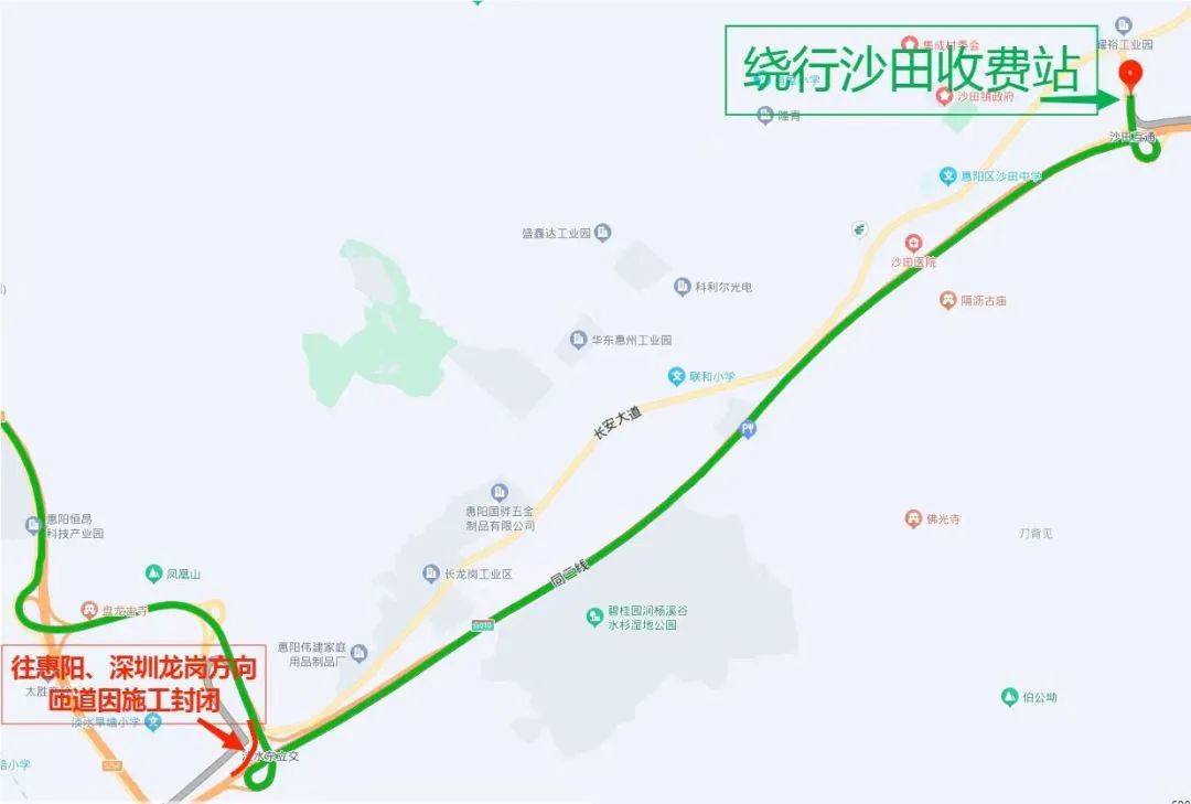 受限車(chē)輛可沿汕尾、汕頭方向行駛至沈海高速沙田收費(fèi)站繞行,或從淡水東收費(fèi)站駛出,繞行白云六路、迎賓大道、淡水收費(fèi)站。
