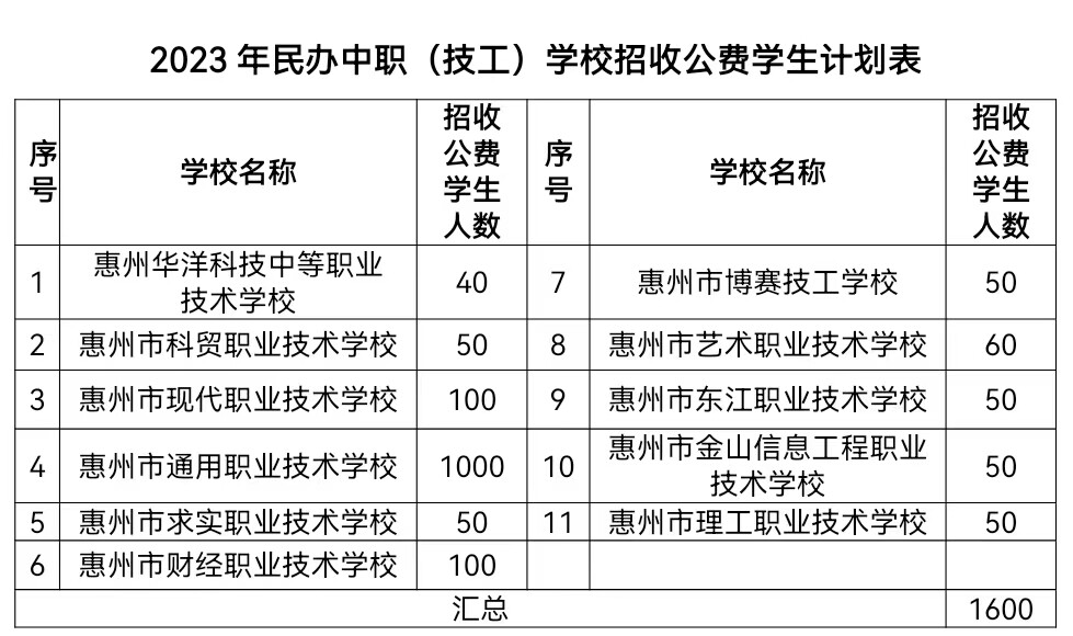 答:一是從2015年春季學(xué)期起,國家對就讀中職、技工院校的所有農(nóng)村(含縣鎮(zhèn))戶籍學(xué)生和城市涉農(nóng)專業(yè)學(xué)生及家庭經(jīng)濟困難學(xué)生免除3年學(xué)費(藝術(shù)類相關(guān)表演專業(yè)除外,民辦學(xué)?梢匝a收差額學(xué)費)。二是從2015年春季學(xué)期起,國家對全日制正式學(xué)籍一、二年級涉農(nóng)專業(yè)學(xué)生和非涉農(nóng)專業(yè)家庭經(jīng)濟困難學(xué)生每人每年補助生活費2000元。三是今年我市有11所民辦中職、技工院校參照《惠州市市屬公辦職業(yè)院校生均基準(zhǔn)定額標(biāo)準(zhǔn)》招收公費生,具體招生條件詳詢招生院校。公費生招生計劃見下表:
