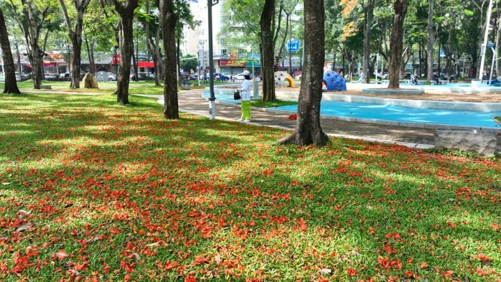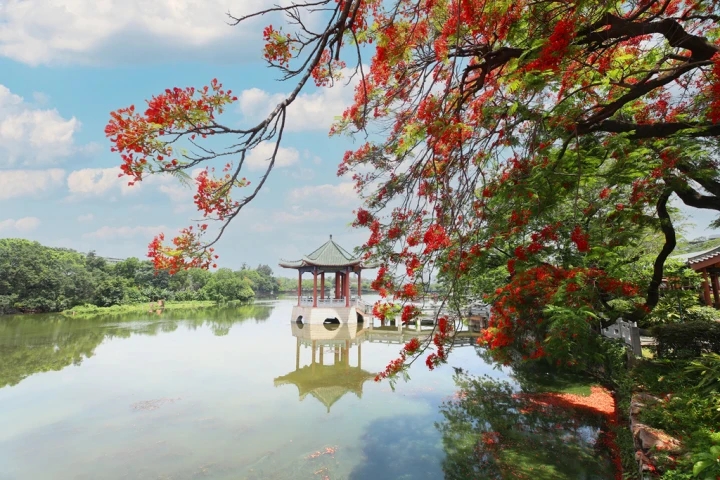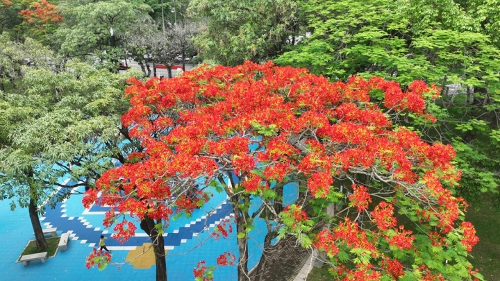 火紅的鳳凰花開滿枝頭,與公園藍(lán)色的運(yùn)動休閑地相映成趣。