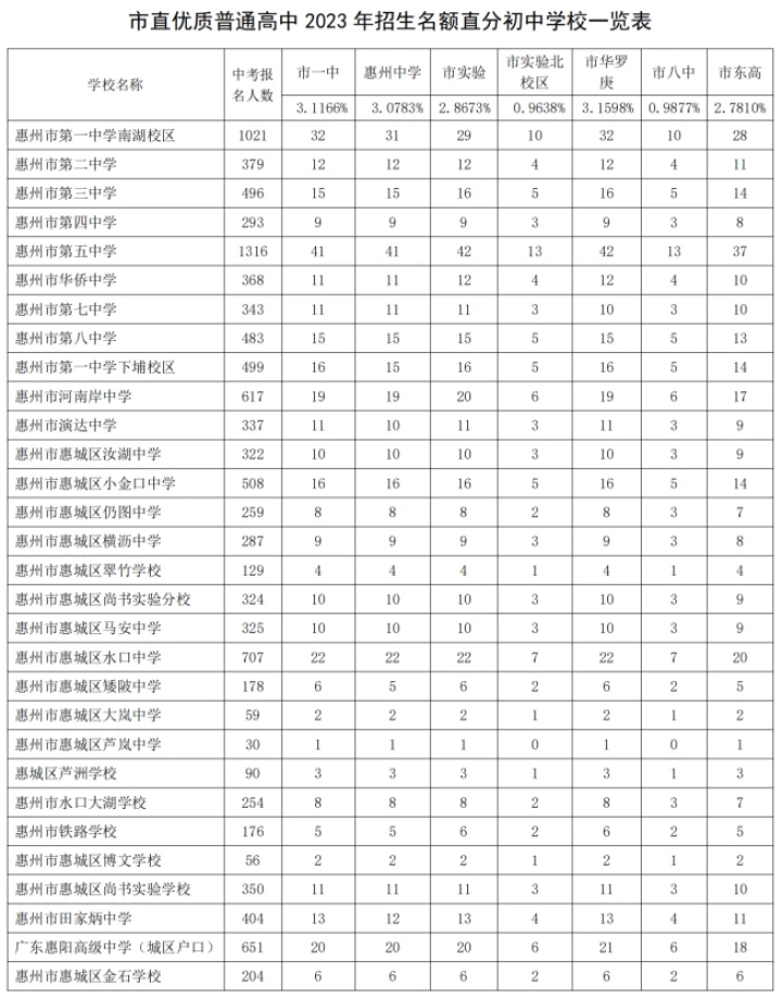 5月18日,惠州市教育局發(fā)布《關(guān)于下達(dá)市直優(yōu)質(zhì)普通高中2023年招生名額直接分配到初中學(xué)校指標(biāo)數(shù)的通知》,今年我市繼續(xù)實(shí)施優(yōu)質(zhì)普通高中學(xué)校招生名額按比例合理分配到區(qū)域內(nèi)初中學(xué)校的政策。2023 年參照2022年做法,錄取時(shí),按考生填報(bào)的第一志愿錄取。
