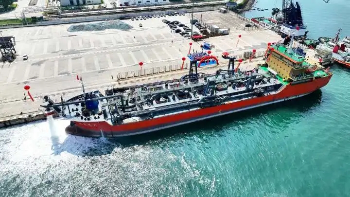 據(jù)介紹,“中啟7”是國(guó)內(nèi)設(shè)計(jì)制造,擁有雙機(jī)、雙槳、雙舵、雙耙,具有艏吹功能的自航式耙吸挖泥船,船總長(zhǎng)114.5米,型寬19.8米,型深9.6米,挖泥深度32米,泥倉(cāng)倉(cāng)容7143m?,總噸6520噸,耙頭帶有高壓沖水裝置,可挖掘黏土、密實(shí)細(xì)沙、粗沙、淤泥等,配有耙平器可以進(jìn)行掃淺工作,水下泵施工效率高。
