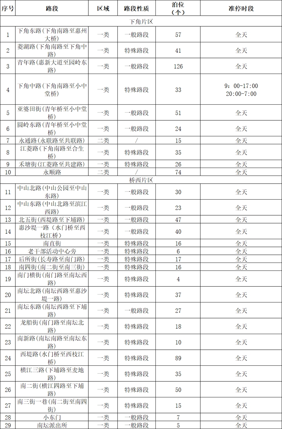 下角、橋西片區(qū)(共974個泊位,其中下角片區(qū)10條路段,482個泊位;橋西片區(qū)19條段路,492個泊位)