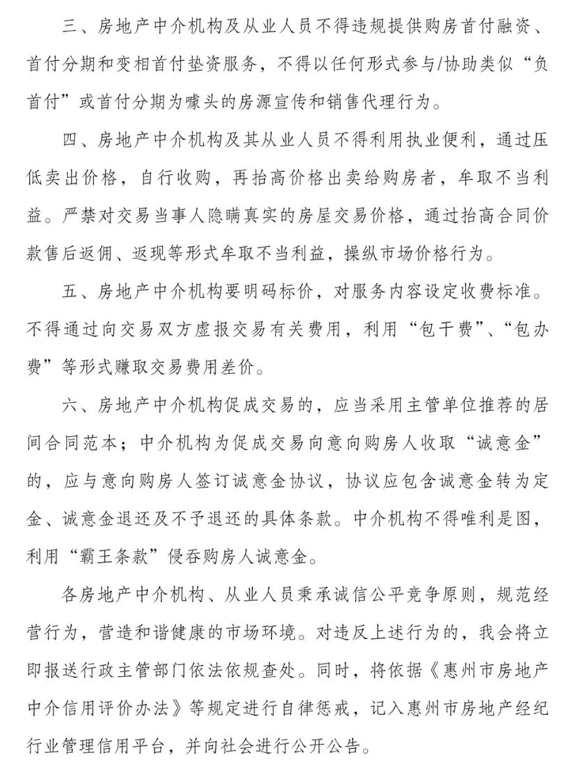 “要求要秉承誠信公平競爭原則,規(guī)范經營行為,營造和諧健康的市場環(huán)境!痹撠撠熑吮硎,對違反《鄭重提示》規(guī)范行為的各房地產中介機構、從業(yè)人員,將立即報送行政主管部門依法依規(guī)查處,同時依據《惠州市房地產中介信用評價辦法》等規(guī)定進行自律懲戒,記入惠州市房地產經紀行業(yè)管理信用平臺,并向社會進行公開公告。