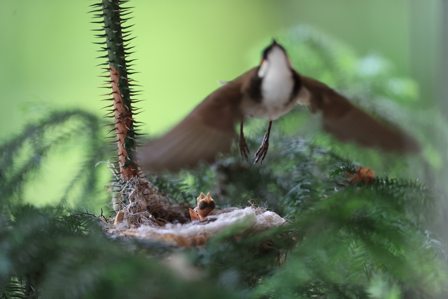 紅耳鵯一窩產(chǎn)了4枚蛋,4月29日第一只幼鳥破殼而出,剩下的3枚蛋也陸續(xù)孵化成功。4只可愛幼鳥的父母,不辭辛勞地穿梭在小區(qū)周邊地區(qū),捕捉各種昆蟲、植物的果實、米飯等給它們喂食,忙得不可開交。