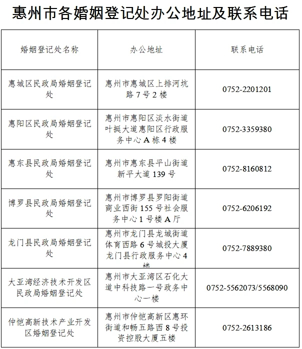 附:惠州市各婚姻登記處辦公地址及聯(lián)系電話(表格另附圖片)