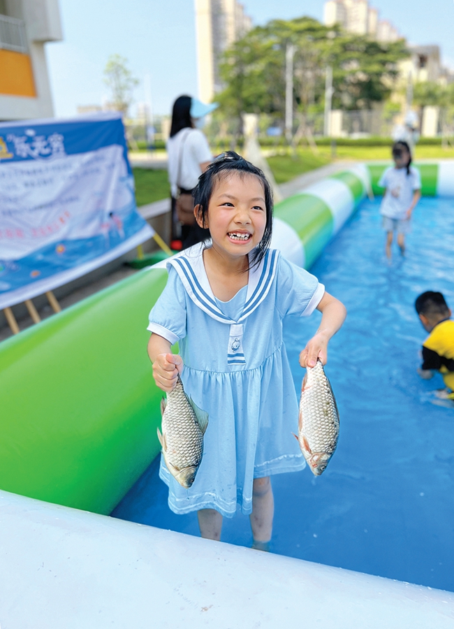 惠城區(qū)金山湖小學(xué)的孩子們?cè)谛@里開心抓魚。