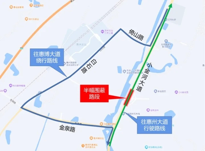 為確保施工期間道路交通安全、暢通、有序,惠州市公安局交通警察支隊(duì)根據(jù)《中華人民共和國道路交通安全法》等有關(guān)法律法規(guī),對施工路段實(shí)施臨時交通組織。惠州交警建議,小金河大道往惠博大道方向車輛請繞行倚山路-白石路-金泉路,后返回小金河大道;小金河大道往惠州大道方向車輛根據(jù)交通指引可沿原路線通行。