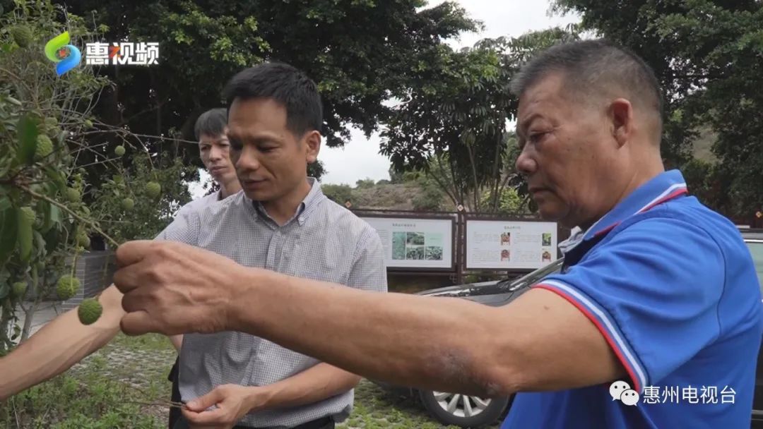 在果園里,惠東縣農(nóng)業(yè)推廣中心農(nóng)技師幫農(nóng)戶查看荔枝掛果情況,傳授管理經(jīng)驗。