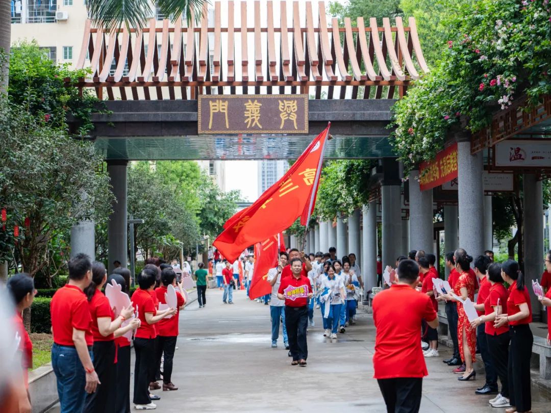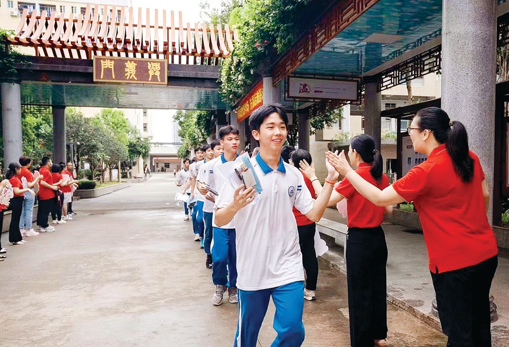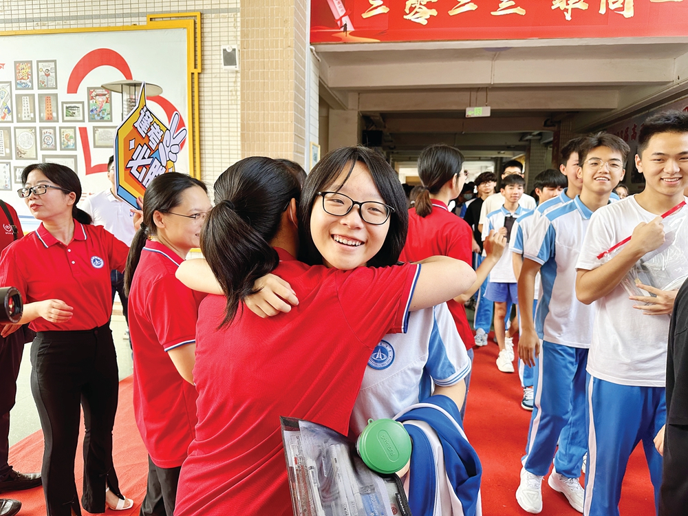 過成功門,走紅地毯,擊掌,擁抱,惠州市華羅庚中學(xué)為學(xué)生們舉行了儀式感滿滿的送考儀式;輬(bào)全媒體記者范文燕 攝