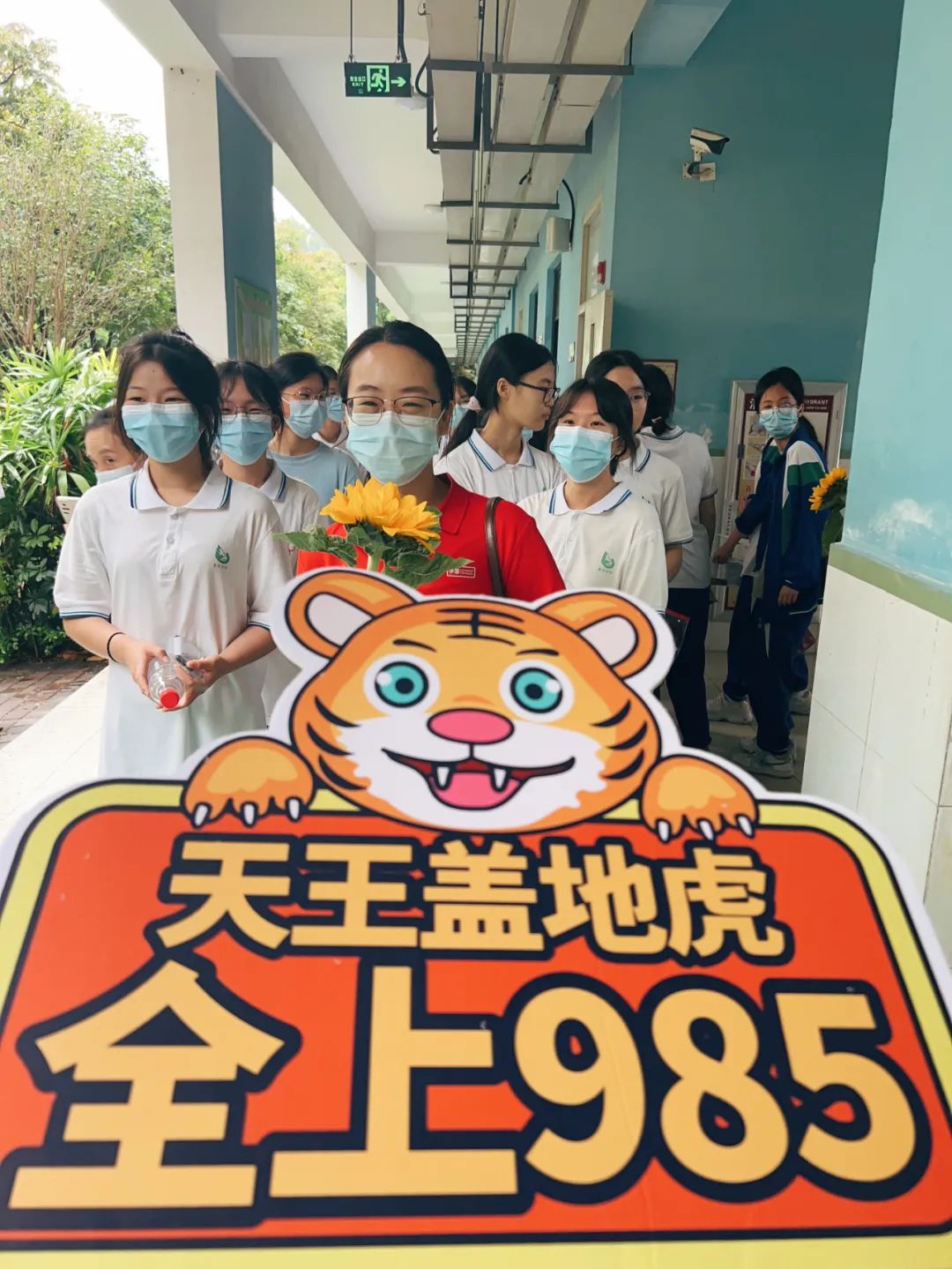 惠州市綜合高級(jí)中學(xué)的考生們?cè)诳记盎ハ喙膭?lì),合影留念。學(xué)校也為考生們舉行了暖心十足、激情澎湃的送考儀式。在手拿“考神附體、勢(shì)不可擋”祝福標(biāo)語(yǔ)的老師的帶領(lǐng)下,考生們排隊(duì)步入考場(chǎng),道路兩旁迎接他們的是身穿紅色旗袍、紅色衣服“喜慶穿搭”的教師送考隊(duì)伍。