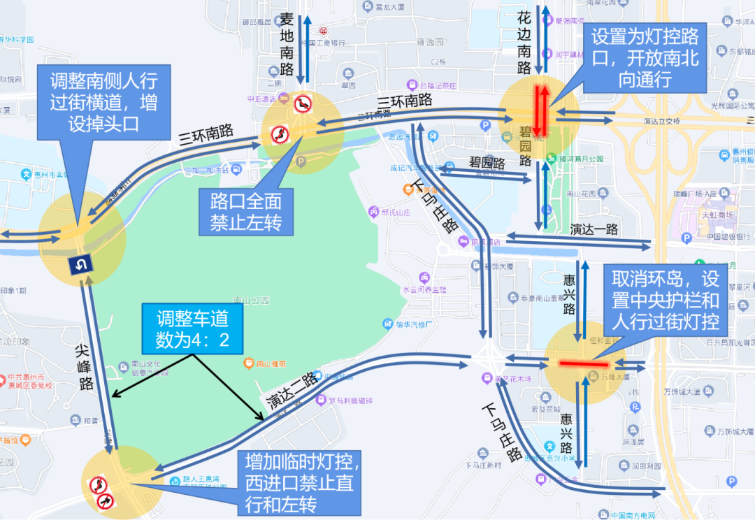 二、交通組織調(diào)整:施工期間,三環(huán)南路/麥地南路路口全面禁止左轉(zhuǎn);三環(huán)南路/花邊南路路口設(shè)置為燈控路口,開(kāi)放南北向通行;演達(dá)二路/惠興路路口取消交通環(huán)島并設(shè)置東西向中央護(hù)欄和人行過(guò)街燈控;演達(dá)二路/尖峰路路口設(shè)置臨時(shí)燈控,西進(jìn)口禁止直行和左轉(zhuǎn);三環(huán)南路/尖峰路路口調(diào)整南側(cè)人行過(guò)街橫道位置,并增設(shè)掉頭口;尖峰路路段車(chē)道數(shù)調(diào)整為北往南4車(chē)道、南往北2車(chē)道;演達(dá)二路(尖峰路-下馬莊路段)路段車(chē)道數(shù)調(diào)整為西往東4車(chē)道、東往西2車(chē)道。