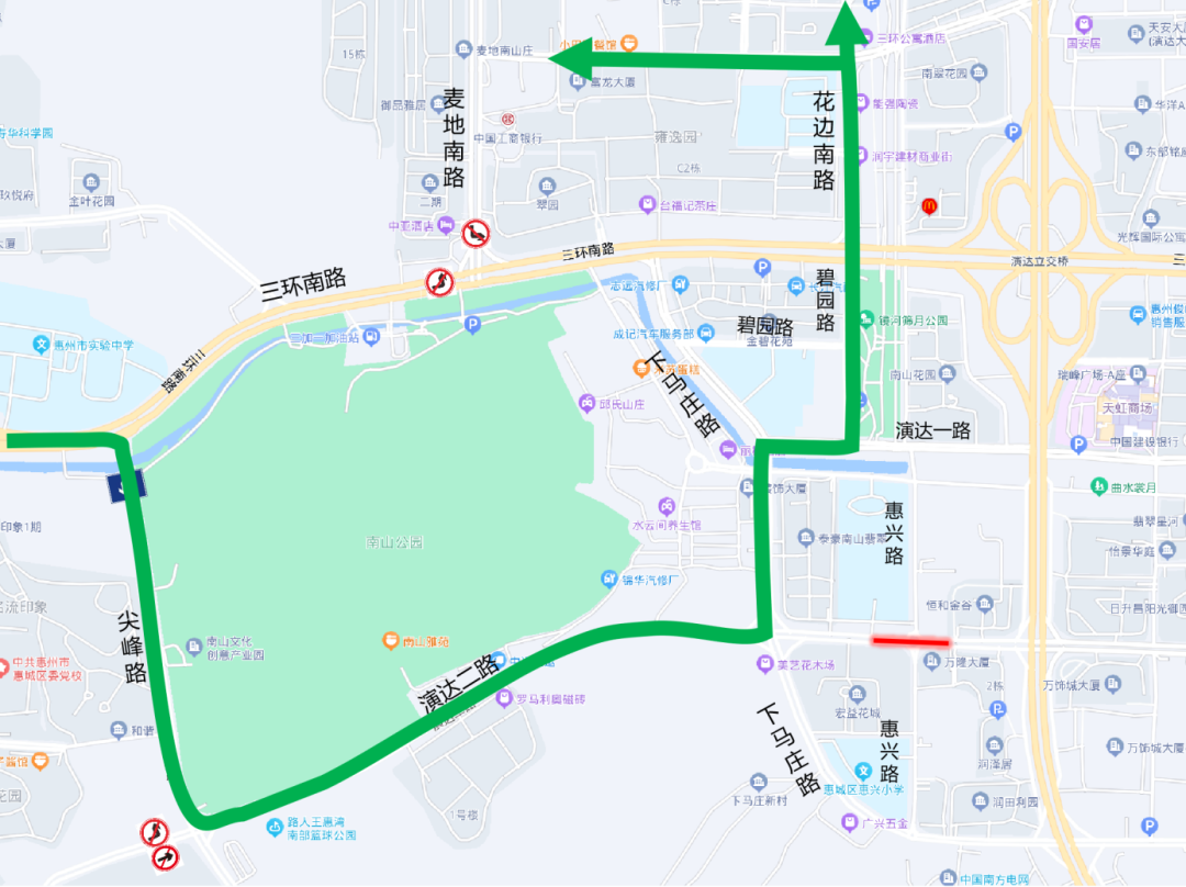 三、推薦繞行路線:仲愷往麥地南路方向車(chē)輛推薦繞行尖峰路-演達(dá)二路-下馬莊路-演達(dá)一路-碧園路-花邊南路等道路通行。
