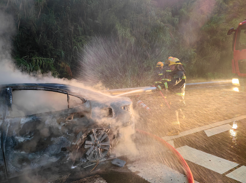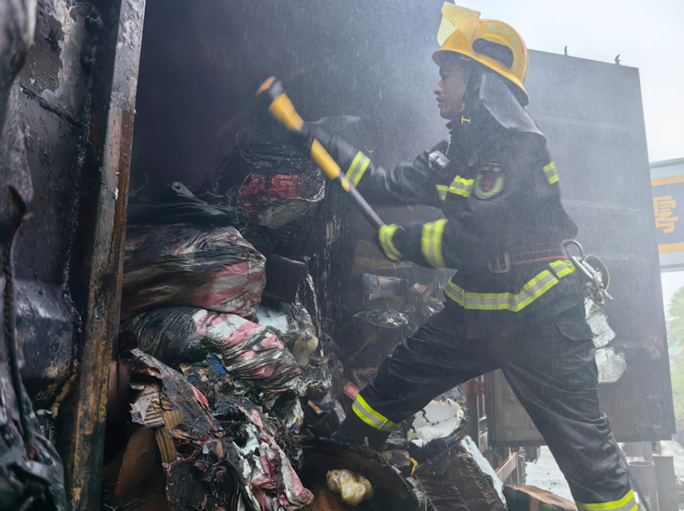 現(xiàn)場(chǎng)消防員發(fā)現(xiàn),被追尾的貨車裝載著滿滿的快遞,?吭趹(yīng)急車道,濃煙滾滾,火勢(shì)相當(dāng)猛烈,有明顯的燒焦味。而小轎車卡在貨車車尾,同樣燃燒猛烈。
