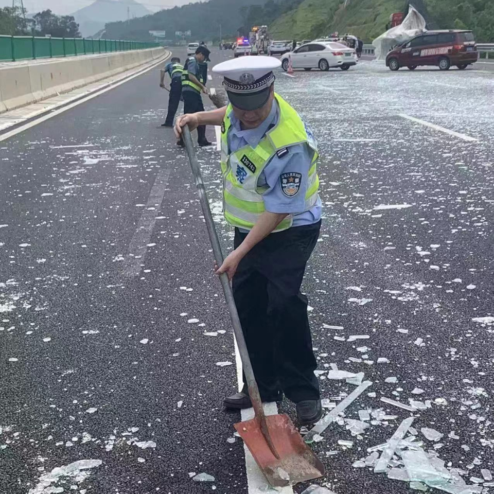 不久后,養(yǎng)護部門、拯救車輛陸續(xù)到達,民警協(xié)同施救人員一起對現(xiàn)場進行清理,冒著烈日高溫,利用鐵鏟、掃把等工具第一時間清理出一條安全車道供車輛行駛。繼續(xù)不停歇地打掃2小時后,路面上所有的碎玻璃及其他障礙物最終被徹底清理干凈,道路也恢復了正常通車。