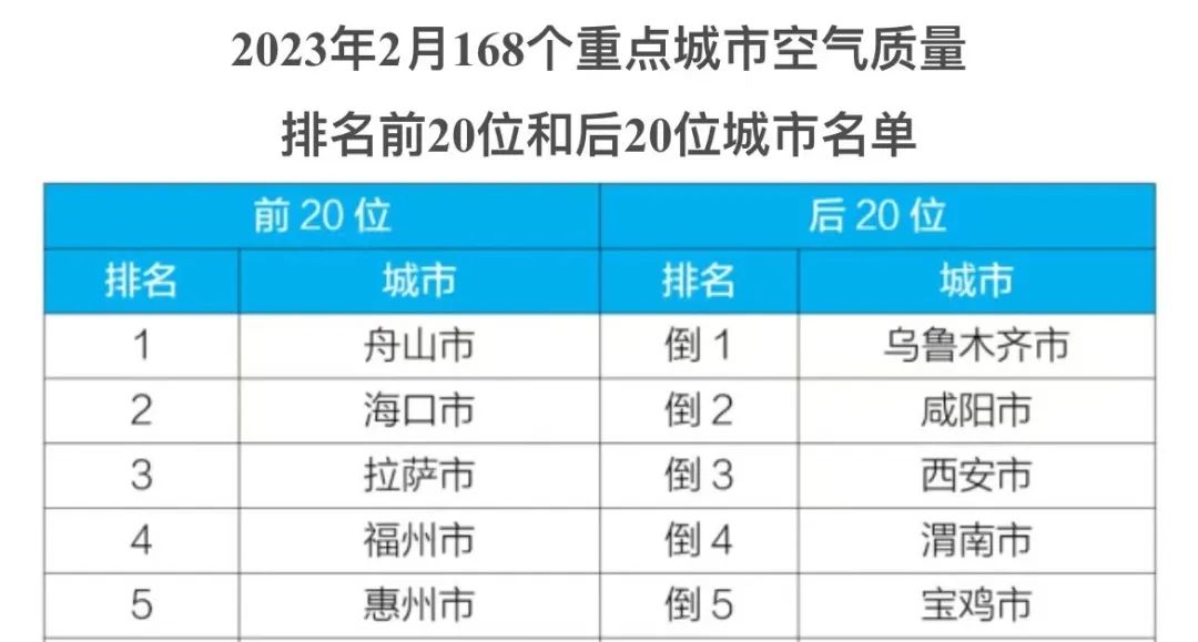 2023年1~4月168個重點(diǎn)城市空氣質(zhì)量排名前20位和后20位城市名單。圖源廣東生態(tài)環(huán)境。